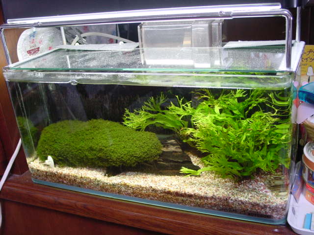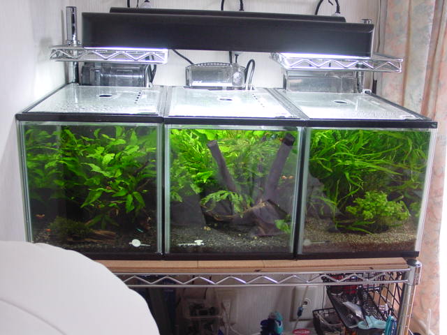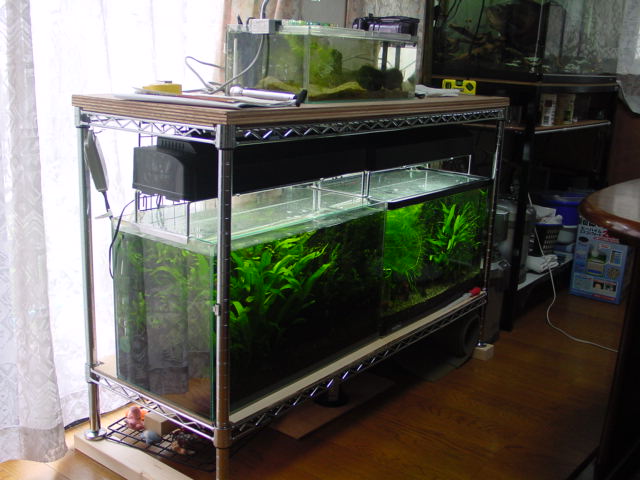 こないだ苦労してやった、リビングの模様替え。 リビングって言うても、正確には、『水槽』の配置替え。 こんな感じになりましてん。 手前に見えるのが、新しい台。 上段に、幅120cmの水槽を置く予定。 現在は、カメ(カブトニオイガメ)の水槽が乗ってます。 下段にあるのは、60cm幅の水槽が2台。 奥にかすかに見えてるのが、90cm幅の水槽です。 大きな魚達(ポリプテルス達・オスカーなど)がいてますねん。 あと、こちらも。 以前、違う位置にあったのを、ソファ(旦那の指定席)のとなりに移動。 3台ともアピストがメインで入ってます。 なかなか子供は育ちませんが。。。 この水槽で、幅25cm、奥行き40cmです。 下段は、収納スペース。 あとは、模様替えで移動してないけど、オマケ。 画像の角度、悪いですね(^^; 食器棚の間にある水槽です。 人が近づくと、魚達は隠れてしまい、何もいない水槽みたいになってしまってます(--; 幅45cmやったと思います。 小さな魚が泳いでるんですがねぇ。。。