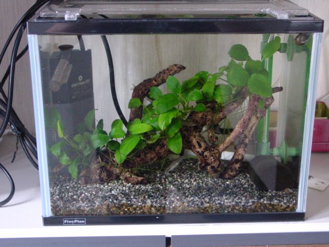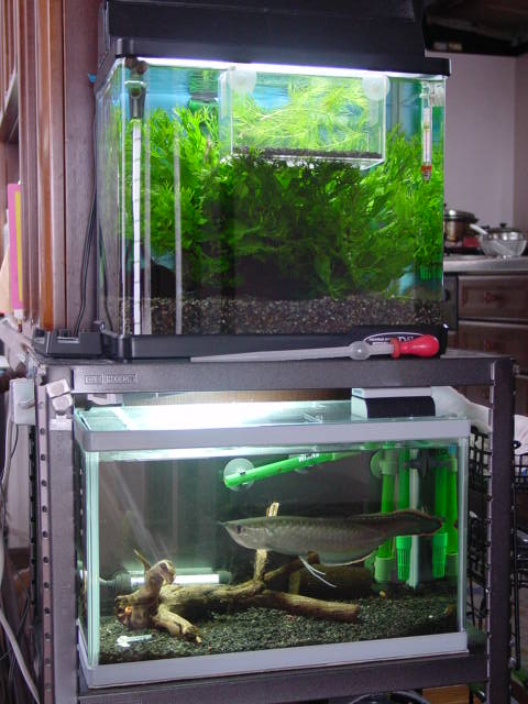 食器棚の横面にくっついて立ってる棚には、この2台。 上段が、先日アップした『アノマラ・ベビー』や、その親兄弟がいてますねん。 下段は、これまた最近アップしたブラック・アロワナ。 旦那は、120cmの水槽には、この子を一番に入れたいそうで。 現在、非常に狭そうです。 これで、リビングに現在おいてる水槽全部。 10台です。 さらに、玄関においてるのも。。。 なんて名前やったっけ? 次男が、水路で捕まえてきた魚が入ってますねん。 この水槽で幅30cmくらいやったっけ? もう、私にはワケわかりませんわ。。。 これで、ぜ~んぶです。 あとは、120cmが、そのうち増えるやろうってことです。 またもや、人間の居場所が減って行く~~~!!